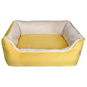 Měkoučký obdélníkový pelíšek z umělého beránka se zvýšenými okraji pro pohodlný odpočinek.