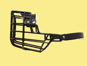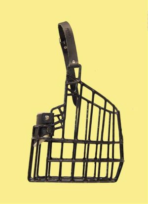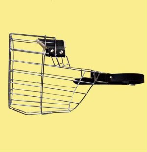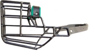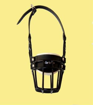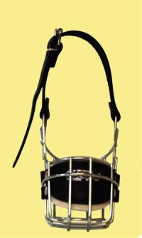 Kovový náhubek s upínacími řemínky z barexu.