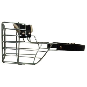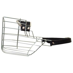 Kovový náhubek s koženými řemínky na zapínání.
