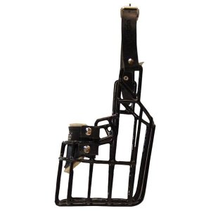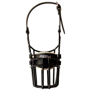 Kovový černý náhubek s koženými řemínky na zapínání.