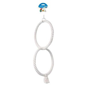 Dva kovové kruhy omotané bavlněným lanem jsou k sobě navíc spletené.