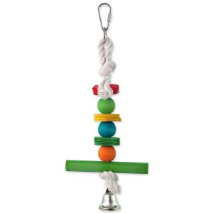 Závěsná hračka pro ptáky. Vyrobeno z topolového dřeva, bavlněného provazu a železa.