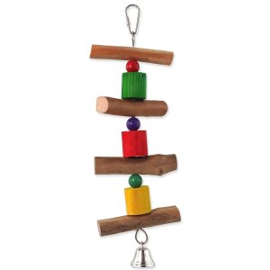 Závěsná hračka lanové kruhy se zvonečkem a dřívky vhodná pro střední a velké exotické ptactvo.