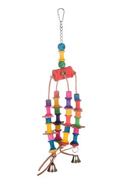 Barevná dřevěná houpací hračka pro ptáky se zvonečkem z přírodních materiálů.