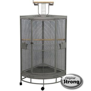 Rohová voliéra Nadia XL pro papoušky pro středně velké papoušky je přizpůsobená na postavení do rohu místnosti.