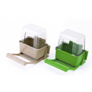 Závěsné plastové krmítko do klece je opatřeno bidýlkem, je vyrobeno ve třech přírodních barvách.