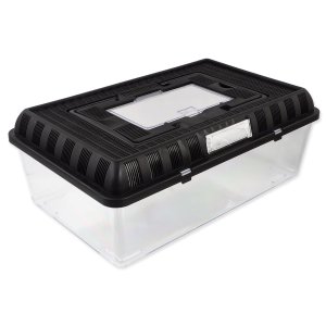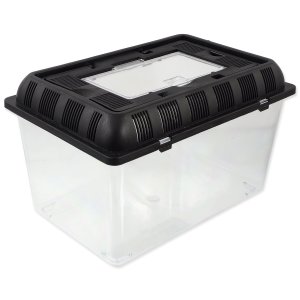 Přenosný průhledný plastový box pro terarijní zvířata.
