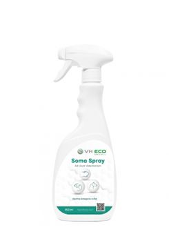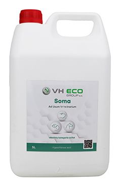 Veterinární přípravek ve spreji pro ošetření postižených míst na pokožce a sliznici u všech druhů zvířat. Složení: Aktivní chlór uvolněný z kyseliny chlorné, chlordioxid (aktivní látky), chlorid sodný, voda. Druh a kategorie zvířat: Všechny druhy zvířat. Účel použití: VH Eco Soma je superoxidovaný roztok, který se používá ke zvlhčování a ošetřování akutních a chronických povrchových ran a popálenin menšího rozsahu a odřenin u zvířat.