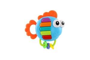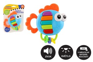 Chrastítko ve tvaru rybky je díky svým veselým barvám a tvaru u dětí velmi oblíbené. Chrastítko po zmáčknutí kláves hraje melodie a tóny jednotlivých kláves. Při hře klávesy svítí. Na zadní straně je možné nastavit zvuky melodií nebo tóny. Je vyrobeno z plastu a lze jej tak snadno omýt. Je na baterie 2x1,5V (AAA), které jsou součástí, na zadní straně je pojistka, kterou je potřeba před hraním vyjmout. Rozměr chrastítka: 14 x 14 cm Vhodné pro děti od 3 měsíců