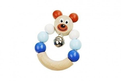 Chrastítko s medvídkem v modré barvě. Rolnička jemně cinká. Chrastítko má nízkou hmotnost a je vhodné pro děti od 6ti měsíců. Výrobek splňuje požadavky EU na bezpečnost hraček. Rozměry výrobku jsou 70x90 mm a je připevněn na papírové kartě. Rozměry balení 10,5 x 17 x 2 cm.