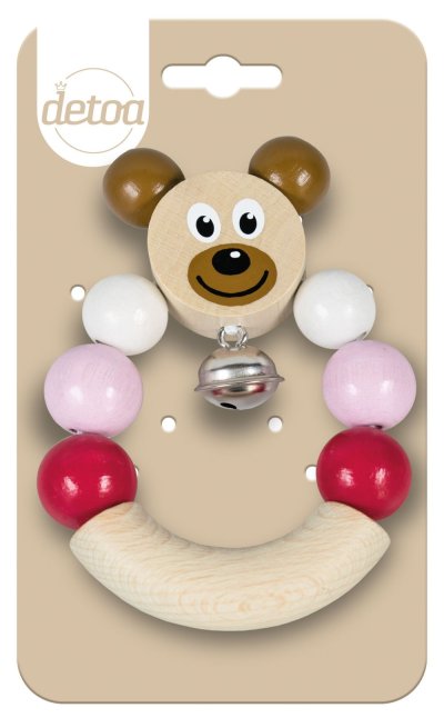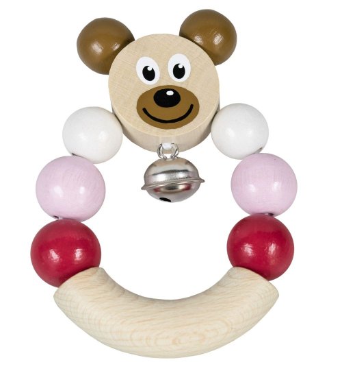 Dřevěné chrastítko s medvídkem v růžové barvě. Snadno uchopitelné, rolnička jemně cinká.