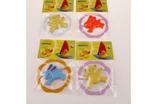 Pestrobarevné chrastítko s motivem medvěda či zajíce. Rozvíjí motorické a zrakové dovednosti dítěte.