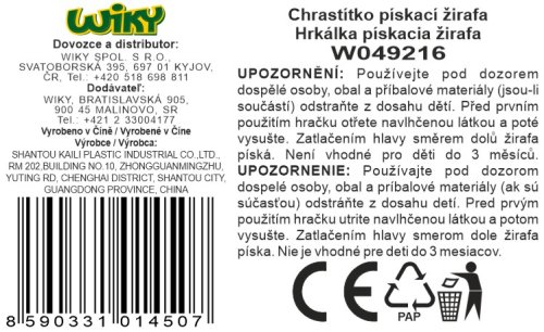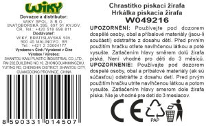 Chrastítko pískací žirafa. Velikost 16 cm. Zmáčknutím hlavy směrem dolů píská.