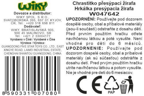 Chrastítko přesýpací žirafa. Velikost 24,5 cm. Přesné rozměry 7x6,5x24,5 cm.