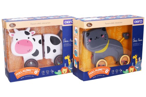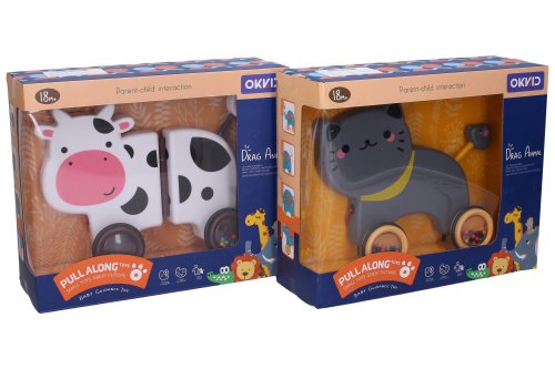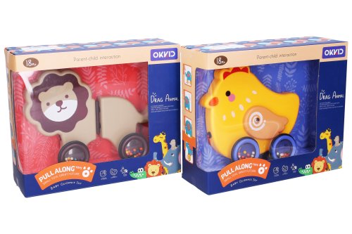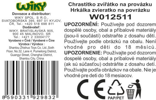 Chrastítko zvířátko na provázku. Velikost 19 cm. 4 varianty - kuře, kočka, lev, kráva. Volná kola.