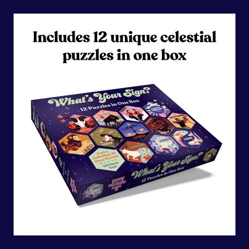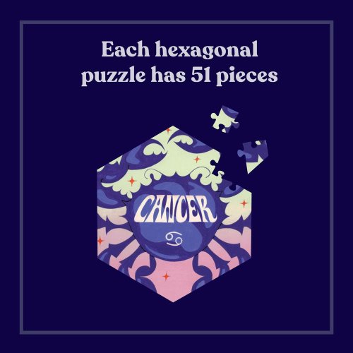 Tato sada 12 puzzle v jedné krabici obsahuje dvanáct různých znamení zvěrokruhu, z nichž každé je samostatně vyobrazeno na nádherném barevném šestihranném puzzle s 51 dílky.