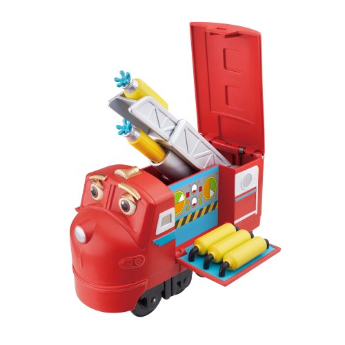 Lokomotiva s transformační funkcí. Po stisknutí vrchní části lokomotivy se automaticky vysunou různé pracovní pomůcky.