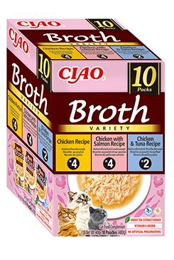 CIAO BROTH Multipack obsahuje 10 kapsiček natrhaného kuřecího masa v lahodném kuřecím vývaru. Pečlivě vybrané suroviny a přísně kontrolovaná čerstvost. Vaše kočka si bude užívat lákavé aroma a neodolatelnou chuť při každém otevření kapsičky! Vyrobeno ze 100% čistého kuřecího prsa. Žádné obiloviny, konzervanty ani umělá barviva. Vysoký obsah vody, který je prospěšný pro celkové zdraví koček. Nízký obsah kalorií.