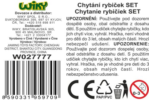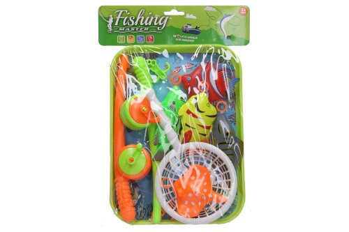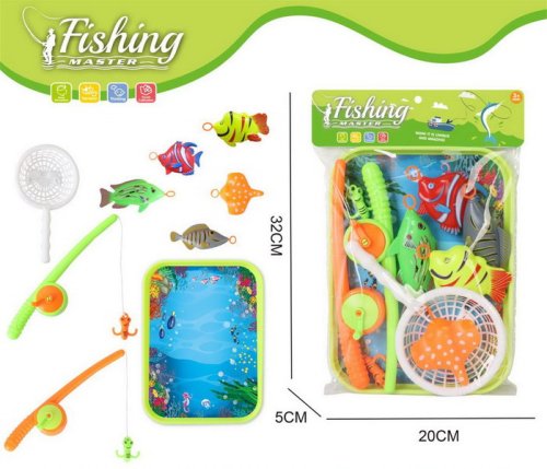 Chytání ryb. Rozměry vodní plochy 27x20x2 cm. Součástí 5 ryb, 2 udice, síto, vodní plocha.