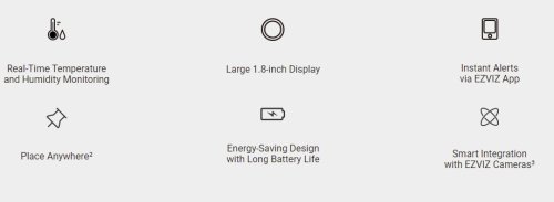 Chytrý senzor disponuje 1,8" displejem pro přehledné zobrazení aktuální teploty a vlhkosti vzduchu v místnosti. Po propojení s chytrou bránou EZVIZ H3 (není součástí) je možné v mobilní aplikaci kdykoliv sledovat všechny údaje, nastavit upozornění při překročení zadaných hodnot nebo vytvořit úplně nový scénář zahrnující další chytrá zařízení. Napájení má na starost jedna baterie typu CR2450, která udrží senzor v provozu až 1 rok. Díky integrovanému stojánku a přiložené lepicí pásce ho lze umístit kamkoliv na vodorovný či svislý povrch.