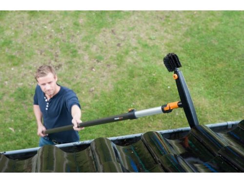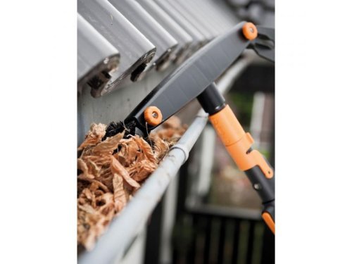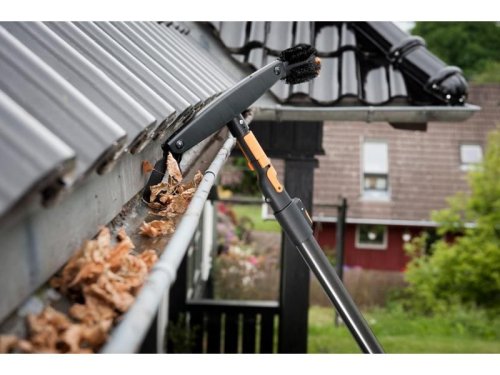 Důmyslná kombinace kartáče a škrabky v jednom nástroji umožňuje perfektní vyčištění okapů. Nastavitelný sklon kartáče zajišťuje jeho optimální polohu a bezpečnou práci ze země. Používá se s teleskopickými násadami. Šířka: 45 mm, délka: 310 mm, hmotnost: 330 g. Původní Fiskars číslo: 135542.
