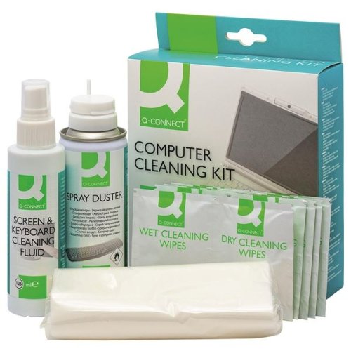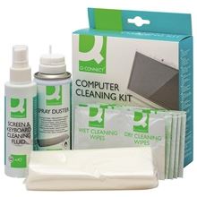 Sada na čištění obrazovek a klávesnic PC značky Q-Connect Obsahuje: 150 ml sprej, suché/mokré ubrousky, láhev 125 ml čisticího roztoku na obrazovky a suché absorpční kapesníčky