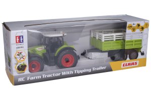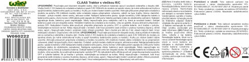 Claas Traktor s vlečkou RC na dálkové ovládání. Rozměry 43,6x11,4x19 cm. Frekvence 2.4GHz. Světelné efekty. Bateriový pack 3.6V 300mAh do traktoru součástí, 2xAA do ovladače nejsou součástí. USB kabel součástí. Přepínač ON/OFF na spodní straně traktoru a na ovladači. Tlačítko pro světelné efekty na ovladači. Sklopná a rozložitelná vlečka. Sklápění vlečky otočným mechanismem v zadní části traktoru. Obrázky s funkcemi na zadní a spodní straně obalu.