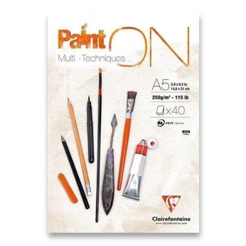 Blok A5 Clairefontaine Paint on White ma extra bílý papír ze 100% celulózy. Papíry jsou vhodné pro suchou i mokrou techniku a mají dobré absorpční schopnosti. Obsahuje 40 listů a má gramáž 250 g/m2. Tento víceúčelový papír je možné použít na techniky: tužka, inkoustové pero, technické pero, kvaš, temperu, akryl, inkoust, akvarel, křídu, uhel, pastel, fix. neobsahuje kyseliny pH neutrální certifikace PEFC hladký