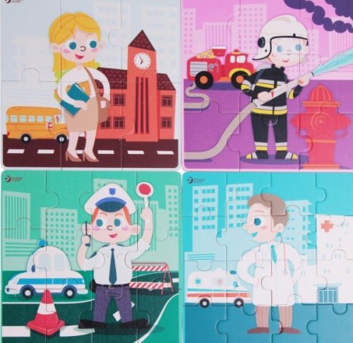 Dřevěné puzzle s motivem povolání (policista, hasič, lékař, učitelka). Skládáním puzzle si děti procvičují své pozorovací schopnosti, trpělivost a jemnou motoriku. Balení obsahuje 4 odlišné puzzle motivy s různým počtem dílků (6,9,12 a 16). Baleno v kartonové krabičce. Vhodné pro děti od 18 měsíců. Rozměr složeného puzzle cca 20 x 20 cm