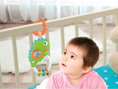 Barevné chrastítko pro nejmenší ve tvaru veselého chameleona lze zavěsit na postýlku, kočárek i autosedačku.