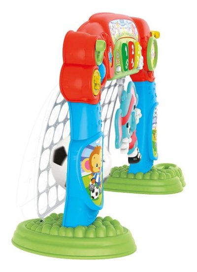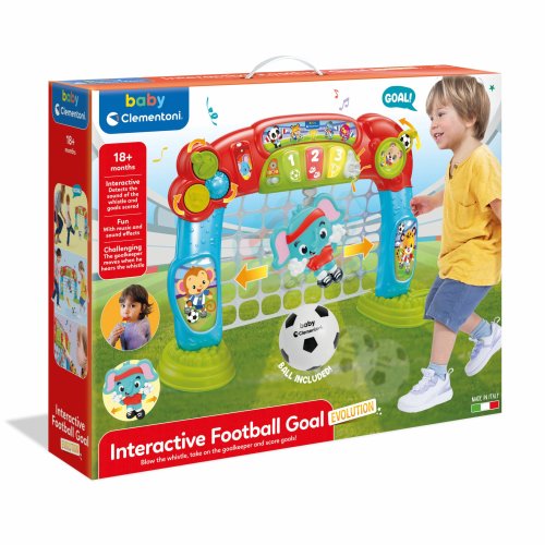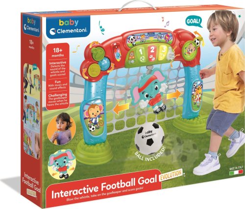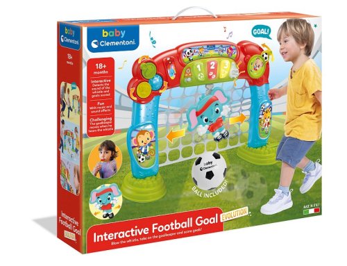 Fotbalová branka Clementoni s brankářem a aktivitami.