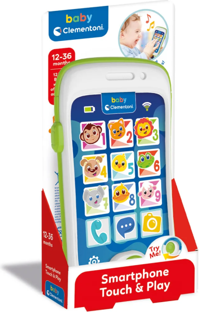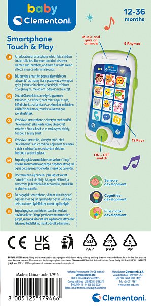 Smartphone touch and play je elektronická imitace mobilního telefonu pro nejmenší děti. Má 12 dotykových tlačítek se zvířecími zvuky a hudbou. Zábavný vzdělávací smartphone, ze kterého bude Vaše dítě "volat jako máma s tátou". Se spoustou melodií a zvukových efektů. Provází dítě světem zvířat a jejich zvuků. Se 3 barevnými LED světly. Obsahuje baterie: 2xAAA/LR03, pouze pro demonstrační účely. Rozměry hračky: 13 x 7 x 1,8 cm. Rozměr balení: 20 x 10 x 4 cm. Věk: 12 m+