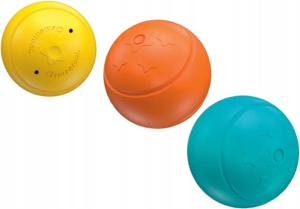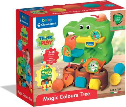 tři kuličky - každá v jiné velikosti, skutálejí se do kmene a objeví se za dvířky stejné barvy, rozvíjí logické myšlení a koordinace oko–ruka, pomáhá trénovat jemnou motoriku (uchopit kuličku, otevřít dvířka).