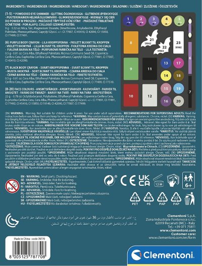 Fantastická sada pro líčení dětí se vším, co potřebujete pro úžasné malování na obličej! Otevři krabičku a objev paletu s očními stíny, tužkami na tělo, aplikátorem a houbičkami. Kazeta se zrcátkem na vnitřní straně lze po vypotřebování použít pro uchování různých drobností. Před použitím odstraňte ochrannou fólii ze zrcátka.