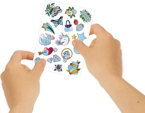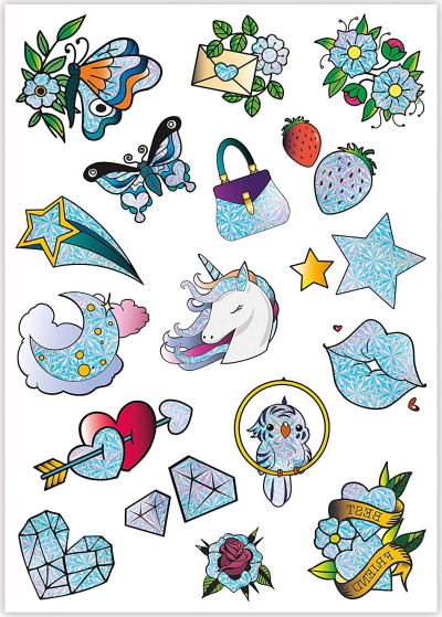 Neodolatelné třpytivé tetování pro styl se super elegantním nádechem. Jednoduše vystřihněte své oblíbené tetování, přiložte ho na kůži, navlhčete houbičkou a je hotovo! POZNÁMKA: Tetování je dermatologicky testováno.