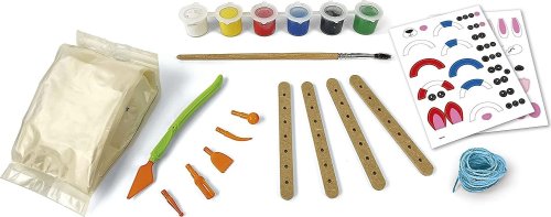 Obsahuje : slané těsto, pracovní nástroj s vyměnitelnými hroty, temperové barvy a štětec, dřívka, šňůrku, kartonové dekorace, obrázkový návod