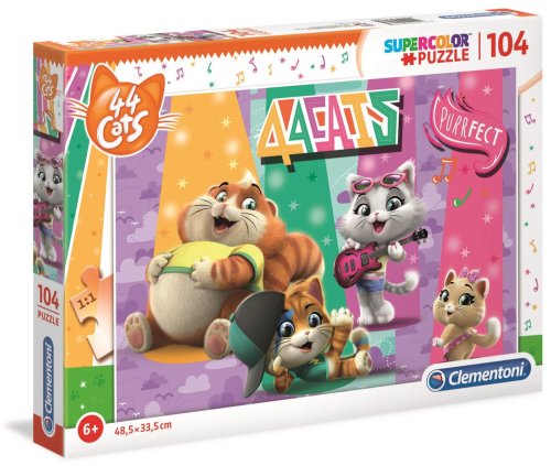 Dětské puzzle ze série SuperColor Collection s motivem oblíbeného animovaného seriálu 44 koček. Puzzle SuperColor Collection - edice navržená speciálně pro děti, pomáhá jim rozvíjet manuální zručnost a schopnost pozorování. Kvalita materiálů a exkluzivní technika tisku zaručují trvale krásné, živé a zářivé barvy. Doporučeno pro děti od 6 let. Rozměr složeného puzzle cca 48,5 x 33,5 cm