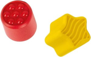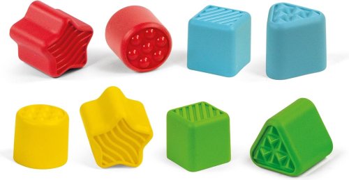 Osm kostek různých tvarů a textur odpovídají otvorům ve střeše. Zlepšuje manuální koordinaci a logické myšlení při spojování tvaru a šablony otvoru. Stimuluje smyslový vývoj doteku díky výrazným texturám na tvarech a měkkému povrchu střechy autobusu. Hmatová vkládačka je vhodná také pro nevidomé děti.