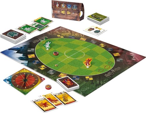 Obsahuje: 4 balíčky karet představující Bradavické koleje, herní desku, karty počasí a polí, žeton zlatonky, žeton potlouka a žeton camrála.