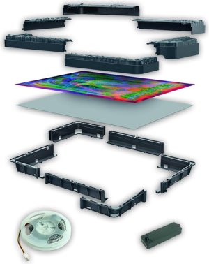 Balení obsahuje: puzzle, tvrdý karton, lepidlo, montážní plastový rám, elektronický modul, RGB LED pásek, referenční plakát a návod k použití. Při rozsvíceném světle se zobrazí obrázek jako překrytí tří barevných úrovní. Když světlo zhasnete a zapnete LED, uvidíte obraz odpovídající barvě LED.