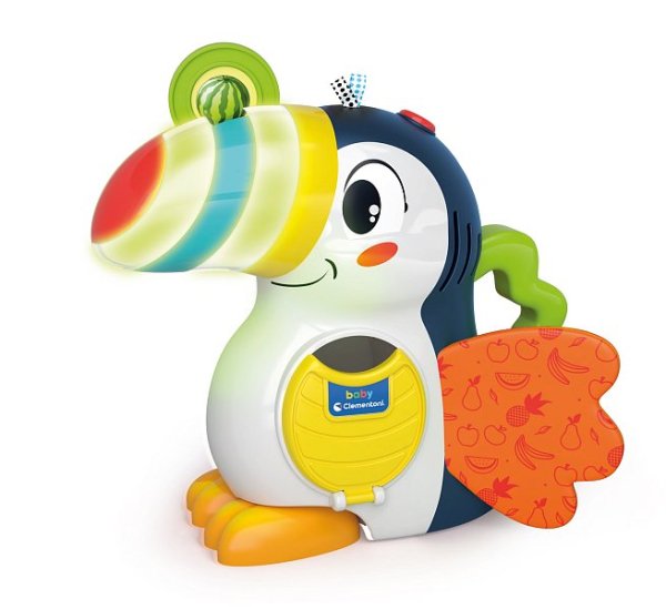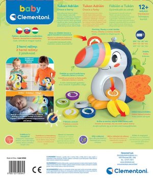 Seznamte se s Adriánem, okouzlujícím interaktivním tukanem z kolekce baby Clementoni, který vaše ratolesti bude učit hrou. Tento krásný ptáček je navržen speciálně pro nejmenší děti, aby jim pomohl objevit svět prvních slov, barev a ovoce prostřednictvím zábavného a pohlcujícího zážitku. Když vaše děťátko vloží jednu ze sedmi mincí s různě tvarovaným ovocem do Adrianova zobáku, tukan ovoce pozná, pojmenuje ho a jeho zobák se rozsvítí v barvě daného ovoce. Kromě učení tukan děti baví písničkami a říkankami. Hračka komunikuje v češtině, slovenštině a maďarštině. Hračka podporuje kognitivní a senzorický rozvoj. Baterie: 3 x AAA, jsou součástí. Rozměry balení: 24 x 26 x 9 cm. Věk: 12 m+