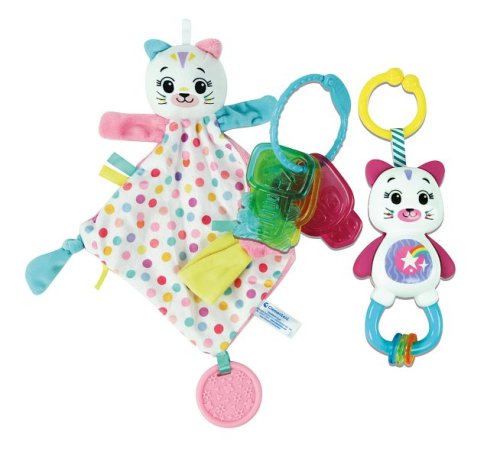 Krásná sada, která obsahuje vše, co byste kdy mohli chtít přivítat do rodiny novorozenou holčičku: měkkou přikrývku, pestrobarevné chrastítko a klíče na kousátka z měkkého plastu. Barevné chrastítko ve tvaru roztomilého koťátka se spoustou bezpečných částí z měkké gumy a praktickým kroužkem na zavěšení. Žvýkací klíčky pomáhají s prořezáváním zoubků, zatímco přikrývka byla vyrobena tak, aby vypadala jako milé kotě, které bude pro vaši holčičku prvním parťákem na hraní. Jasná barevná paleta, zvuky, pohyblivé kousky a různé textury podporují multismyslový rozvoj dítěte. Rozměry balení: 29,7x5,3x29,7cm. Věk: 0+