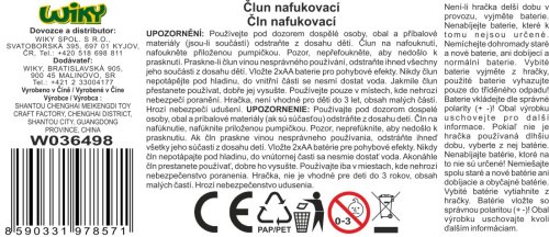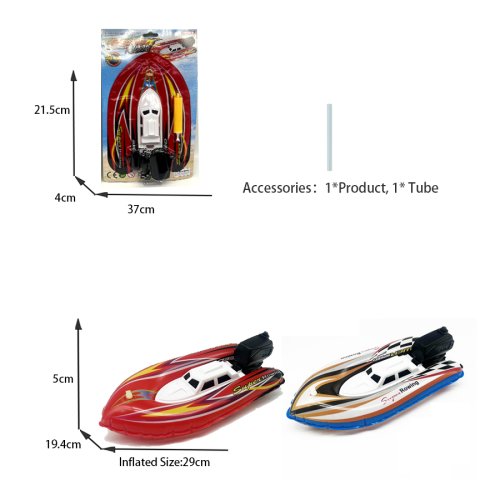 Člun nafukovací. Rozměry 21,5x3x37 cm. Součástí pumpa. 2 varianty - červená, modrá. 2xAA baterie nejsou součástí.