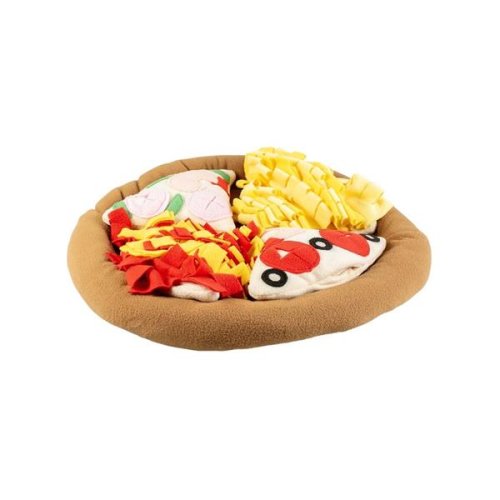Čmuchací dečka v podobě pizzy je skvělé místo pro schování suchého krmiva či pamlsků. Interaktivní hračka stimuluje lovecký instinkt psa nebo kočky, zabaví je při hledání pamlsků a zabraňuje hltání potravy, čímž pomáhá předcházet problémům s váhou. Spodní strana má protiskluzovou úpravu. Rozměry (cca): 50 × 50 × 5 cm Materiál: fleece Barva: hnědá, žlutá, červená Údržba: Lze prát v pračce na 30 °C. Upozornění: Hračka není určena dětem. K použití pouze pod dohledem. Hračku pravidelně kontrolujte a v případě poškození přestaňte používat.