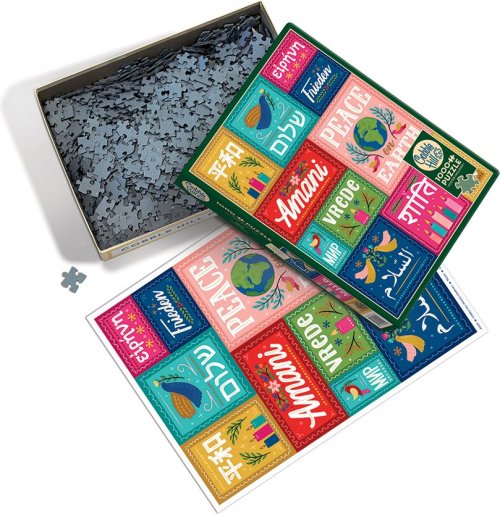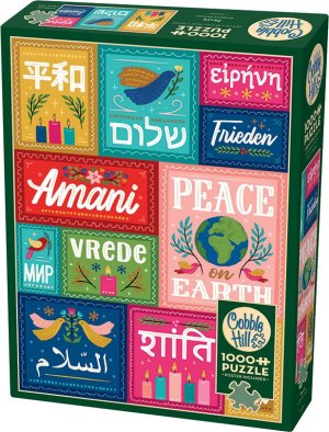 Mír si přejeme v jakékoliv době. Puzzle oslavuje mír po celém světě. Každý z barevných bloků vyjadřuje slovo mír v jiném jazyce. Horní řada: japonština, hebrejština, řečtina, němčina Uprostřed: svahilština (červená), ruština,ukrajinština,a další slovanské jazyky využívající cyrilici (tyrkysová), afrikánština,nizozemština (zelená), angličtina Spodní řada:arabština, hindština, francouzština Raznice puzzle COBBLE HILL nekopíruje standardní mřížku, rohy a hrany dílků nejsou vždy v jedné ose a dílky mají neobvyklý tvar. Obtížnost puzzle je tak vyšší než u klasické mřížkové raznice, kterou používají přední výrobci v Evropě. Součástí balení je i předloha o velikosti 31,6 x 22,9 cm. Rozměr složeného puzzle cca 48,9 x 67,6 cm
