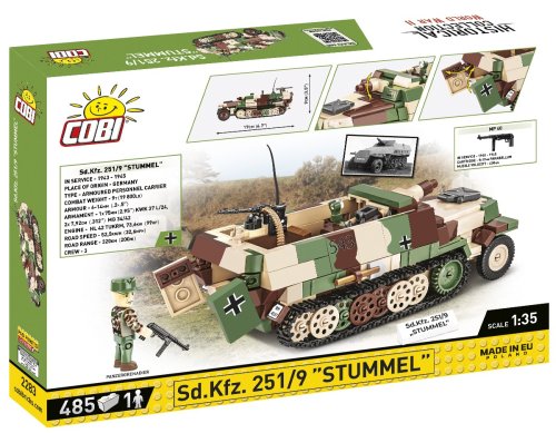 Postavte si model Sd.Kfz.251 základní polopásový obrněný transportér německé armády během 2. světové války. Výroba různých verzí probíhá již od roku 1939. Na jeho základě byla postavena i další bojová vozidla. Jedním z nich byl „Stummel“ vybavený krátkohlavňovým 7,5 cm kanónem Stu.K.37 ráže 75 mm, který byl vytvořen jako vozidlo palebné podpory. První vozidla tohoto typu byla vyrobena v roce 1942. Balení obsahuje 485 kostek a 1 figurka.