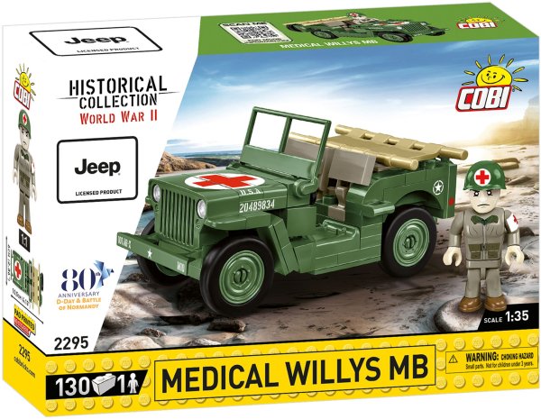 Postavte si model Jeepu Willys MB v provedení sanitky v měřítku 1:35, vydaný u příležitosti 80. výročí Vylodění v Normandii (D-Day). Sestavený model měří 10,5 x 6 x 5 cm. Balení obsahuje 130 kostek stavebnice a figurku vojenského zdravotníka.