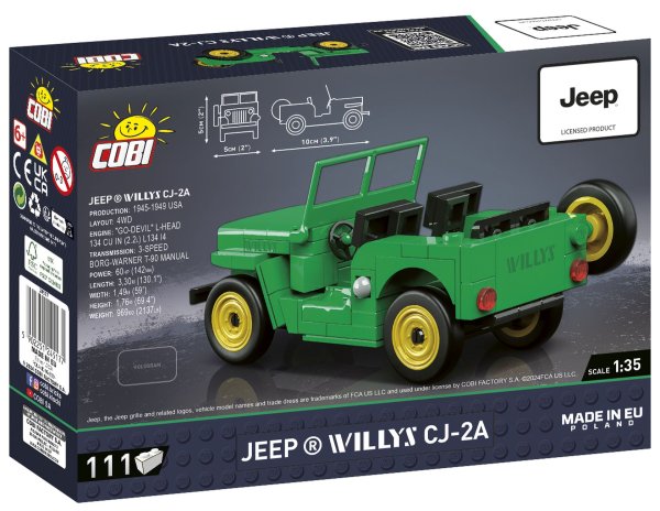 Postavte si model JEEP WILLYS CJ-2A, vyvinutý v měřítku 1:35, obsahuje speciálně navržené prvky s charakteristickou mřížkou Willys a okenním rámem. Poté, co firma Willys-Overland v roce 1944 vyrobila pro armádu malý terénní vůz, byla v následujícím roce uvedena na trh produkční varianta pro soukromé zákazníky, označená továrním kódem CJ-2A. První generace Willys CJ představila v masovém měřítku proporce karoserie charakteristické pro pozdější modely Jeep, včetně jasně vyznačených blatníků, vypouklé kapoty, kulatých, úzce rozmístěných světlometů a svislých lišt masky chladiče. Balení obsahuje 111 kostek.