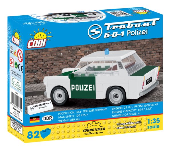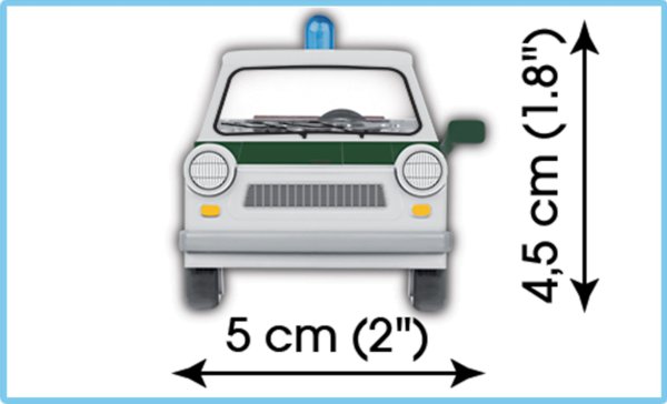 Postavte si model vozu východoněmecké automobilky Trabant 601 v měřítku 1:35. Autíčko je vyvedeno v policejní úpravě s modrým majáčkem. Prosklení je vyrobeno z transparentního plastu a autíčkem jde při hře lehce pojíždět. Model po sestavení měří 10cm na délku, 5cm na šířku a 4,5cm na výšku.