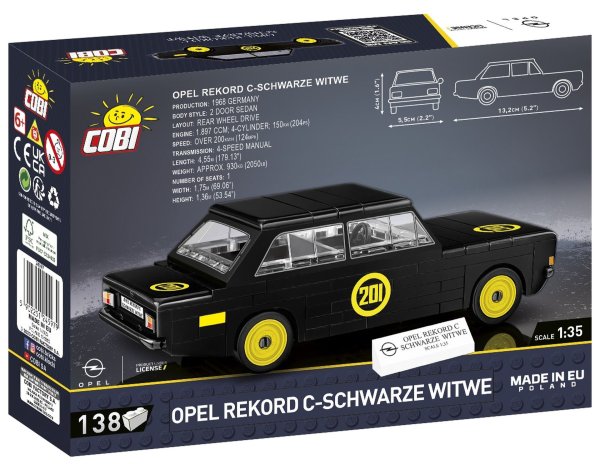 Postavte si model sportovního auta Opel Rekord C „Schwarze Witwe“ (černá vdova) v měřítku 1:35. Model je vydán v licenci značky Opel. Nejslavnější Opel Rekord „Schwarze Witwe“ vznikl tajně! V rámci koncernu General Motors měl Opel zákaz závodit. Navzdory tomu továrníci připravili sportovní verzi Rekordu s motorem o výkonu 180 koní. Kvůli žlutým aplikacím na černém laku se mu přezdívalo „Závodní taxi“ a „Černá vdova“. Vůz se stal senzací a zúčastnil se velkolepých závodů. Balení obsahuje 138 kostek stavebnice, neobsahuje figurky.